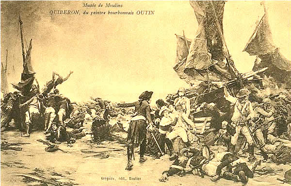 Samedi 27 juin une escadre de Trois vaisseaux de ligne de 74 canons, deux frégates de 44, quatre bâtiments de 30 à 36, plusieurs chaloupes canonnières et 60 bâtiments de transport ont fait voile vers les côtes de France. L'expédition était d'importance : 80 000 fusils, 80 canons, des munitions, de la poudre, des uniformes, des souliers pour 60 000 hommes, des biscuits, de la viande salée, du brandy et des réserves de faux assignats. La division était forte de 4 000 hommes, comprenant, avec les 3.600 émigrés répartis en 5 régiments, 20848 prisonniers de guerre français qu'on avait enrégimentés en leur promettant la liberté. Les troupes sont débarquées sur les plages de Carnac et viennent rejoindre les Chouans de Bretagne. Leur objectif commun : restaurer la monarchie en France : "Pour les Emigrés en 1795, chasser du pouvoir les assassins de Louis XVI, les géôliers de Louis XVII, rétablir la monarchie et plus encore la religion persécutée, c'est faire oeuvre de croisés". "On ne peut comprendre le drame de Quiberon si l'on oublie ce point de vue" écrit Madame Claude Dervenn dans "Quiberon Presqu'île"  Attaque de Quiberon par les troupes républicaines - d'après Swebach et Desfontaines
