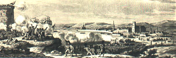 | Le pont levis du camp retranché est ouvert, le drapeau tricolore flotte sur les hauts du Fort. A cette heure, la seule force royaliste encore intacte est la division de Charles de Sombreuil. Autour, les villages de la presqu' île sont totale. Puisaye, enfin réveillé, à jugé la situation Sa réaction est immédiate: il n'y a plus qu'a se rembarquer. Il bat le rappel des troupes vers les chaloupes anglaises. Galopant vers le Sud, il rencontre Sombreuil qui a rassemblé ses troupes.Il lui donne l'ordre de rebrousser chemin et d'aller occuper le moulin de St-Pierre qui domine la Presqu'île. Lui-même prend le prétexte de mettre des documents à l'abri pour s'enfuir par la mer dans la chaloupe qui l'attendait...
