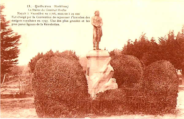 Une note discordante à propos de l'érection de cette statue, une lettre du Marquis de Roys, petit-fils de Hoche, datée du 18 juillet,donne les raisons pour lesquelles l'unique héritier du Général n'assistera pas aux cérémonies de Quiberon: "L'érection de la statue du Général Hoche à Quiberon est une mauvaise action, un défi et une arme de combat... Personne du Comité de Quiberon n'a tenté une démarche vis-à-vis de moi. On a eu raison. Si ma santé, chancelante depuis plusieurs années, me l'eut permis, je me serais rendu en Bretagne dans ces jours-ci, et pendant que des individualités sans mandats auraient péroré, j'aurais demandé des prières dans l'église de Quiberon où j'aurais cherché refuge". Le monument a été édifié à l'initiative des Bleus de Bretagne et des villes de Quiberon et de Lorient grâce à une souscription nationale. Le dimanche 20 juillet 1902 à onze heures, le train minE0 onze heures, le train ministériel entre en gare. En descendent, Monsieur Camille Pelletan Ministre de la Marine, des amiraux, Bienaimé, Marquer et Leygues, des Généraux, Grisot, Bertin et Reverard, M. Guieysse, député, le Préfet du Morbihan, le Sous-Préfet de Lorient, M. Nail, Maire de Lorient. M. Chanard, Maire de Quiberon, leur souhaite la bienvenue. Le cortège se dirige vers la place Hoche et prend place sur l'estrade prévue à cet effet. Le voile qui recouvre le monument tombe. Les applaudissements crépitent au son de la musique militaire. C'est lors de la restauration de cette statue après un attentat à la bombe qui l'avait endommagée que l'on s'est rendu compte que cette statue était une oeuvre maitresse d'un sculpteur important du 19ème siècle Aimée Jules Dalou : Plus de détails sur le sculpteur Dalou en annexe. Marcel Calvez fondateur de la maison du Patrimoine et co-rédacteur des pages histoires de ce site, a écrit un livret sur cette inauguration mouvementée