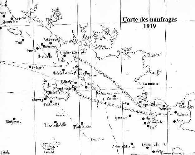 1917 A la suite de nombreux torpillages par les sous-marins allemands autour de Quiberon, une plate forme d'aviation est aménagée près de Port Haliguen ( près de l'emplacement de l'aérodrome actuel, à l'endrot ouse trouve la résidence Adal d'Arvor). Une escadrille équipée d'avions Caudron et chargée de la surveillance maritime côtière de Groix à Sarzeau y est stationnée. Quiberon accueille alors beaucoup de réfugiés. Plus sur "L'Aviation Maritime à Port Haliguen en 1917" en doc annexe" 17 avril 1918 Naufrage du Florence H en baie de Quiberon Plus de détails carte de ces naufrages (1919) 2 mai 1918 Naufrage du Paquebot à voile Monte Carlo 25 août 1922 par une paisible soirée d'été alors que l'escadre est mouillée dans la Baie le croiseur cuirassé "La France" talonne et coule derrière le phare de la Teignouse Sa coque c'est déchirée sur une "tête de roche " non signalée sur les cartes. grace a une évacuation en bon ordre, il n'y aura que 3 victimes., Construit en 1911 (Longueur 165m, largeur 27m, tirant d'eau 9.75m) ce cuirassé avait 12 canons de 305mm, 22 de 138mm et 4 tubes lance torpilles Plus sur ce naufrage