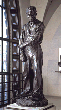 Il échappa aux poursuites en se réfugiant à Londres avec sa famille dont il ne revint qu'après avoir été amnistié en 1880. Néammoins la communauté française de Londres l'accueillit chaudement. Le gouvernement Français de 1876, moins sévère, inclut le bronze La Brodeuse dans sa sélection pour l'exposition internationale de Philadelphy (l'intitulant The Needle-Woman). Dalou rencontra un énorme succès en Grande Bretagne en partie grâce à l'aide des autorités françaises. Eugène Delacroix Jardins du Luxembourg /Paris>>> Le premier coup de pouce vint d'un vieil ami expatrié à Londres depuis longtemps, le peintre Alphonse Legros (1837-1911), qui avait déjà ses entrées dans toutes les expositions prestigieuses de la city depuis les années 1860. Il y montra non seulement des sculptures mais aussi 30 oeuvres sur papier à la Dudley Gallery, (cette découverte récente de la dernière décade du 20ème siècle apporta un nouveau regard sur son activité publique et sur sa relation à la peinture et au dessin). En 1877, bien que comme Legros il parla très peu l'anglais, Dalou devint professeur de modelage à la National Art Training School, South Kensington (rebaptisée le Royal College of Art en 1896) puis très brièvement à la "South London School of Technical Art" (appellée "Lambeth"). Ses cours faits de démonstrations instructives et d'exemples concrets influencèrent profondément toute une nouvelle génération de sculpteurs britanniques. portrait de Lavoisier, dont le marbre se trouve dans l'amphithéâtre de la Sorbonne à Paris Dalou fut le chef de file d'une approche complètement nouvelle des techniques de sculpture que l'on appella "The New Sculptur," (la nouvelle sculpture) qui alliait la sculpture à l'architecture, en combinant les techniques traditionnelles à la nouvelle expression industrielle. Il fut aussi très apprécié en tant que portraitiste et sculpteur de scènes de genre.. Sa statuette de la Boulonnaise à la Branche (Castle Howard, Yorkshire, England) fut l'une des premières acquises par le Comte de Carlisle, en 1871. Fin des années 1870, l'une de ses élèves de la classe de modelage de south Kensington, la Princesse Louise, l'aida à obtenir la commande d'un monument privé pour un des petits enfants de la Reine Victoria mort en bas-âge (Windsor Castle). Il executa sa première commande publique à Londres, Charity (Charité commandé en 1877), une fontaine publique derrière le "Royal Exchange" Lors de son retour en France Dalou déjà connu fut très sollicité. Il consacra le reste de sa carrière à des projets d'utilité sociale en particulier des monuments et des portraits de grands hommes. La ville de Paris lui commanda le triomphe de la république (1879-1899; Place de la Nation) en complément de l'oeuvre du gagnant officiel de la compétition (1879-1883, bronze et pierre ; Place de la République) des frères Morice , le sculpteur Léopold (1846-1920) et l'architecte Charles (1848-1908). Suivirent beaucoup de commandes officielles parmi lesquelles des bas-reliefs historiques ou allégoriques célébrant la République Française, Mirabeau répondant à Dreux-Brézé en 1789, (relief de bronze, Chambre des députés); Fraternité (marbre, Musée du Petit Palais); tous les deux de 1883 et Hommage à Alphand, (pierre, inauguré en 1899, avenue Foch à Paris).