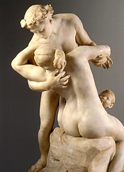 Dalou réalisa deux des plus importants monuments funéraires de ces décades, ceux de l'activiste radical Auguste Blanqui et du journaliste assassiné Victor Noir (respectivement 1885 et 1890, ; cimetière du Père-Lachaise, Paris). Il travailla plusieurs années sur un projet personnel le Monument aux travailleurs, qui n'aboutit jamais et resta toujours au stade de croquis et modelages. Dalou joua un rôle important dans la vie culturelle française en instituant une alternative importante à l'Accadémie et le Salon comme arbitre de l'art moderne. Il fut l'un des membre fondateurs de la Société des Artistes Français et plus tard un des fondateurs de la Société Nationale des Beaux-Arts. Sa contribution à l'honneur de la nation fut officialisée deux années avant son décès lorsqu'il obtint un des plus hauts grades de la Légion d'Honneur lors de l'inauguration du triomphe de la république en 1899. Dalou fut l'un des chefs de file de la sculpture française de la fin du dix neuvième siècle au même titre que Chapu et Mercié . Dalou mourut en 1902 en France Bibliographie Lantéri, Edouard. "Jules Dalou Sculptor." Magazine of Art (English edition) 26 (June 1901): 376-380. Dreyfous, Maurice. Dalou. Sa Vie et son oeuvre. Paris, 1903. Lami, Stanislas. Dictionnaire des sculpteurs de l'école française au dix-neuvième siècle. 4 vols. Paris, 1914-1921: 2:2-15. Caillaux, Henriette. Aimé-Jules Dalou 1838-1902. L'Homme. L'Oeuvre. Paris, 1935. Hunisak, John M. The Sculptor Jules Dalou. New York, 1977. Burollet, Thérèse. "Deux grand fonds de sculpture du musée du Petit Palais: Dalou et Carriès." In La Sculpture du XIX Siècle, Une Mémoire Retrouvée. Rencontres de l'Ecole du Louvre. Paris, 1986. Cadet, Piere. "L'édition des oeuvres de Dalou par La Maison Suisse." Gazette des Beaux-Arts, 6th per., 123, 1501 (Fevrier 1994): 97-110. Butler, Ruth, et Suzanne Glover Lindsay, avec Alison Luchs, Douglas Lewis, Cynthia J. Mills, et Jeffrey Weidman. European Sculpture of the Nineteenth Century. Les Collections de la National Gallery of Art Systematic Catalogue. Washington, D.C., 2000: 97-98. Bacchus et Ariane 1894 Marbre 82 cm highClark Art Institute collections /Massachusset Le sujet est unspiré d'un mythe antique : Ariane, fille de Minos, roi de Crete, a été abandonnée par Thésée sur l'île de Naxos, et est consolée par Bacchus, dieu du vin. Les sculptures de Dalou sont cependant résolument contemporaines, leur anatomie réaliste et le portrait sensuel de leurs émotions donne une impression très réelle. Cette sculpture à la pose gracieuse est l'équivalent sculpté de la peinture de Bouguereau Nymphes et satires