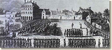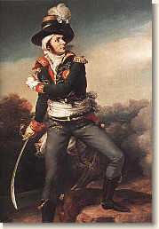 François Athanase de Charette de la Contrie(Couffé, près d'Ancenis, 1763 - Nantes, 1796) << Chef vendéen. Lieutenant de vaisseau, il servit pendant la guerre d'Indépendance américaine, démissionna en 1789 et émigra à Coblence en 1792. Bientôt rentré en France, il se retira dans ses ter< Quand éclata la guerre de Vendée, en 1793, les paysans révoltés contre la République le réclamèrent pour chef. Charette se joignit à Cathelineau, fut de la plupart des combats menés par l'Armée catholique et royale, et se retira, avec ses hommes, après la discussion qui sépara les chefs vendéens (septembre 1793). Il devint bientôt le chef de la Basse-Vendée, poursuivit la guérilla après le désastre de Savenay (décembre 1793), s'emparant notamment du camp républicain de Saint-Christophe, prés de Challans. Le 17 février 1795, Charette signa à La Jaunaie, prés de un traité de pacification avec les envoyés de la Convention, mais il reprit les armes au mois de juillet pour appuyer le débarquement des émigrés à Quiberon. Nommé lieutenant général par le comte d'Artois débarqué à l'île d'Yeu, il lui demanda en vain de se mettre à la tête de l'armée royale. Charette refusa ensuite de se rallier aux Orléans et, traqué par Hoche dans les marais, vaincu à Quiberon, il fut blessé, capturé et fusillé.  Gravure de Pierre.Gabriel Berthault d'après un dessin d'Abraham Girardet. B.N., Cabinet des Estampes.