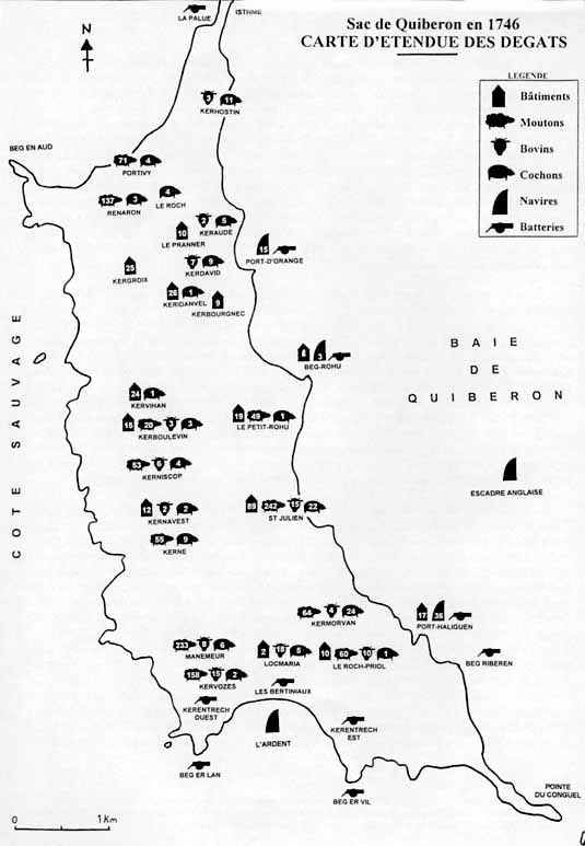 La guerre de succession d’Autriche. Situation de Quiberon. Le débarquement anglais. L’heure des bilans. Analyse de documents Sources La guerre de succession d’AutricheLa guerre avec notre ennemi permanent, l’Angleterre, est déclarée depuis deux années, au sujet de la succession du dernier empereur de la dynastie des Habsbourg sur les trônes autrichien et allemand. En fait, pour la France et l’Angleterre, il s’agit d’un prétexte pour reprendre un conflit colonial qui dure en Amérique et aux Indes depuis la fin du 17e siècle. En 1746, les anglais décident de détruire le siège de la Compagnie des Indes à Lorient. Comme la ville est particulièrement bien protégée par mer, avec la citadelle de Port-Louis, les batteries de Groix, Larmor et Gavres, ils décident d’une attaque par terre. Le 1er Octobre, une escadre d’une cinquantaine de navires, commandée par l’amiral Lestock, débarque au Pouldu les troupes du général Sinclair. Celles-ci atteignent facilement le bois de Kéroman et commencent le siège de la ville. Au bout d’une semaine, alors qu’aucun renfort n’est encore en vue, les lorientais songent à se rendre. Mais suite à des vents contraires, annonçant une violente tempête, les anglais sont obligés de rembarquer précipitamment. Le 9 Octobre, ils sont en mer, tandis que les lorientais fêtent une victoire controversée[3]. Piégés par les éléments naturels, les navires sont bloqués trois jours au Pouldu. Ils auraient pu être facilement bombardés à partir de la côte, mais ne le sont pas par crainte d’une nouvelle descente des troupes de Sinclair. A partir du 12 Octobre, l’escadre anglaise croise le long des côtes morbihannaises. Quatre de ses navires poursuivent l’Ardent. Ce vaisseau français de 64 canons est rescapé d’une escadre revenant d’Amérique. Il s’est perdu suite à la tempête. La quasi-totalité de son équipage est atteinte de scorbut. Dans le registre paroissial du Palais, le curé note que « le douzième Octobre, quatre vaisseaux anglais, échappés de leur flotte, poursuivent un navire du roi français de soixante-dix canons, qui fut obligé de faire côte au Port-Maria de Quiberon, nommé l’Ardent, et le capitaine M. de Ste Colombe. Il fut canonné depuis midi jusqu’à la nuit, s’étant défendu jusqu’à la fin. On lui avait donné, par grâce singulière, 89 marins de Belle-Ile qui sortirent sains et saufs du combat. Le treizième Octobre, la flotte anglaise passa devant Belle-Ile sans faire aucune hostilité, partie du côté de la grande côte, et l’autre passa devant la citadelle, ce qui donna l’alerte à tout le pays... Elle entra le même jour dans la baie de Quiberon où elle n’a fait que côtoyer tout le temps... ». Frustré par son échec à Lorient, l’amiral Lestock pense à une nouvelle descente ailleurs. Dans un rapport qu’il adresse à ses supérieurs à Londres, il précise que la baie de Quiberon « est à égale distance de Brest et de Bordeaux, proche du Port-Louis, Lorient, Le Croisic, Nantes, Rochefort, La Rochelle et de plusieurs autres villes commerçantes, et rien ne peut plus contribuer à la destruction du commerce français, et à notre prospérité, qu’une escadre stationnée ici, car généralement tout navire à destination d’un port quelconque de la baie de Biscaïe vient reconnaître Belle-Ile, de sorte que, par une disposition judicieuse permettant aux croiseurs de se relever mutuellement, tandis que les vaisseaux de ligne seraient au mouillage dans cette baie excellente, on pourrait retirer de grands avantages, ainsi que frustrer les desseins de l’ennemi, par le blocus de ses ports et l’observation de ses mouvements ». Les anglais se préparent donc à un débarquement à Quiberon. Situation de QuiberonJusqu’au milieu du 19e siècle, Quiberon avait un visage quelque peu différent de celui que connaissent les touristes d’aujourd’hui. Les premiers voyageurs remarquent l’absence complète d’arbres, des dunes à perte de vue, l’arrêt de la diligence au gué de l’isthme lors des marées hautes[4], les murets de granit, qui prolongent les maisons, longent les chemins, enserrent les champs. Quelques peintres et écrivains admirent aussi le contraste des couleurs, entre le bleu de la mer, le gris des falaises, le sable blanc des plages... Ce n’est que pour le passage de la voie de chemin de fer dans les années 1880, que l’isthme sera surélevé et renforcé, que les dunes seront fixées par des plantations de pins. Sous l’Ancien Régime, la presqu’île appartient entièrement et directement au domaine royal, relevant de la sénéchaussée d’Auray. Aucun fief, aucun noble, seuls quelques bourgeois et de nombreux roturiers. La population doit être d’environ 1500 personnes en 1746.[5] Elle est répartie dans une vingtaine de villages comptant quelques 300 foyers. Les maisons sont modestes et petites, ne valant guère plus de 300L[6]. Elles sont couvertes de chaume, rarement d’ardoises. Les plus belles semblent situées au Petit-Rohu. Joseph Le Livec y possède une grande maison et une étable pour 1000L, François Le Maux, trois maisons et une belle grange pour 2500L, Patern Le Bras, deux maisons, une grange, une porte cochère en pierre de taille, une étable et un fournil pour 2500L. Les autres importants propriétaires paysans sont Vincent Gourhel avec six maisons à Kervihan pour 1500L, Simon Le Prezec avec trois maisons et une grange à Keridanvel pour 1800L, la veuve Job Le Toullec avec une grande maison, quatre étables, un hangar avec un four à Kerboulevin pour 1500L, Jeanne Michel avec trois maisons à Kergroix pour 1000L, etc... Les quiberonnais s’activent à l’agriculture, avec notamment un important élevage ovin dix fois plus important que celui des bovins. Il y a au moins 1000 moutons sur la presqu’île, dont plus de 200 dans les villages de St Julien et du Manémeur. Les troupeaux sont la possessio