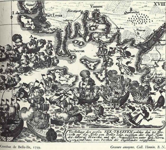 les îles sont bien pourvues (elles aussi) en hommes et équipements : Belle-Ile, Houat, Hoëdic, l'île Dumet fortifiée par le vainqueur de St Cast, le Duc d'Aiguillon. L'amiral de Conflans pense qu'il faut amener l'ennemi, dirigé par l'amiral Hawkes, en baie de Quiberon, où il espère compenser son infériorité numérique par une subtile manœuvre : les placer entre la côte rocheuse très dangereuse (et ses batteries terrestres) et la flotte française. Mais on ne commande pas aux éléments, et dans l'après-midi du 20 novembre, le vent est "très frais" et il n'y a plus guère de visibilité (les ordres se transmettaient par pavillons de couleurs). L'amiral ne parvient pas à organiser correctement son convoi et le combat s'engage trop tôt, entre le Four, l'île Dumet et les Cardinaux.