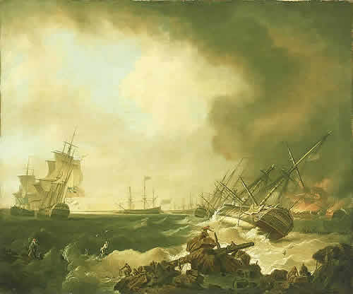 En commentaire, on peut réfléchir au terme "vaisseaux de ligne". Souvent les batailles voyaient un affrontement de lignes de vaisseaux, à coup de canons. Et les anglais étaient non seulement plus équipés, mais aussi beaucoup plus habiles que les français à ce type de sport. Il faudra attendre la bataille de Trafalgar pour que Nelson prouve l'inefficacité de ce dispositif, en s'infiltrant luis aussi entre les rangs des bateaux de l'amiral de Villeneuve avec le résultat que l'on sait. La suprématie du bateau le plus manœuvrant devient évidente, elle était d'ailleurs bien connue des corsaires qui n'hésitaient pas, avec des petits gabarits, à entrer en chasse de bateaux beaucoup plus lourds et plus armés. The Battle of Quiberon Bay (bataille des cardinaux) par Nicholas Pocock, 1812. National Maritime Museum
