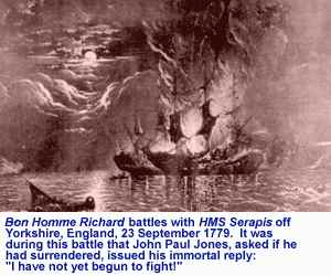 | John Paul Jones 1747 - 1792 | le 6 juillet 1747 John Paul Jones naquit, à Kirkcudbright en Ecosse. Il était le fils d'un jardinier écossais et s'appelait John Paul. À l'âge de 12 ans il entra dans la marine marchande britannique et partit en mer pour la première fois, en tant que garçon de cabine Il navigua à bord des navires marchands et navires d'esclaves, prenant du grade sur une brigantine en 1766 et recevant son premier commandement en 1769. .En 1773, en tant que commandant d'un navire marchand, en état de légitime défense il tua un mutin aux Indes occidentales et, en attente de jugement, pour éviter la prison s'enfuit en Amérique du Nord. A cause de cela, les Anglais l'ont toujours considéré comme un pirate. Fuyant la justice britannique, il essaya de cacher son identité en ajoutant le nom de famille de Jones au sien À la déclaration de guerre avec la Grande-Bretagne en 1775, John Paul Jones alla à Philadelphie, et, avec l'aide de deux de ses amis membres du congrès obtint une commission de lieutenant de marine. L'année suivante il devint capitaine du sloop "la providence" . Pour sa première campagne à bord de la providence il détruisit la pêche britannique en Nouvelle-Écosse et captura 16 bateaux de pêche Anglais Le 14 juin 1777, jour ou le drapeau américain le "Stars and Stripes" fut adopté, il prit le commandement du sloop le "Ranger" construit à Portsmouth. |  | Naviguant en France en 1778, il y rencontra Benjamin Franklin. Le 14 février, Jones reçut des Français le premier salut donné au nouveau drapeau américain par un vaisseau de guerre étranger. | Pendant le printemps il terrorisa la population côtière de l'Ecosse et de l'Angleterre en faisant des incursions audacieuses à terre et en détruisant beaucoup de navires britanniques .Jones fut alors promu commodore et placé aux commandes d'une flotte de bateaux américains et de Français C'est en 1777 que l'Ecossais, John Paul Jones est chargé du rachat d'un navire de guerre à la marine française.En 1778, au moment de la guerre d'Indépendance des Etats-Unis, que John Paul Jones, soutenu par Benjamin Franklin, alors ambassadeur en France, sollicite du Roi un bâtiment pour mener une campagne contre le commerce maritime de l'Angleterre. C'est finalement un ancien bâtiment de la Compagnie des Indes, le Duc de Duras, qui sera choisi, armé et confié à John Paul Jones. Deux ans plus tard alors que Jones rebaptise le " Duc de Duras " en " Bonhomme Richard " il doit équiper le navire de canons. Il choisit Angoulême et les commandes à Sazerac, commerçant et distillateur. Sazerac fait réaliser l'armement par la Fonderie Royale d'Angoulême. C'est à cette époque que la région acquière une reconnaissance internationale : grâce à cette commande de canons pour l'Amérique Sazerac introduit ses eaux de vie et cognacs aux Amériques. En août 1779, armé de 40 canons, le Bonhomme Richard et son équipage de 380 marins dont seulement 75 américains, appareille de Lorient accompagné d'une petite flottille. Il contourne l'Angleterre par l'ouest, passe ensuite au large de l'Irlande puis de l'Ecosse.  | Le 14 août 1779, longeant la côte Est de l'Angleterre, il rencontre un convoi venant de la Baltique escorté par le HMS Countess of Scarborough, un sloop de 20 canons, et le Serapis, un vaisseau de 50 canons. Le combat engagé dans la soirée entre le Bonhomme Richard et le Serapis abouti à un abordage qui se termine vers 22 h 30 par la reddition du Serapis. | Bien que son navire plus petit fut en feu et en train de couler, Jones rejeta la demande britannique de reddition ; "je n'ai pas encore commencé à combattre," répondit il. Un peu plus de trois heures après que la bataille sanglante ai commencé, le Serapis se rendit et John Paul Jones put prendre possession du vaisseau anglais pour y transférer son équipage. | | Bien que considéré comme un héros à Paris et à Philadelphie, Jones rencontra une telle rivalité politique aux USA qu'il n'obtint plus jamais de commandement américain important en mer. .En 1788, l'impératrice Catherine II de Russie le nomma amiral de la marine impériale russe. Il prit une part importante à la campagne de la Mer Noire contre les Turcs. Les intrigues et la jalousie de ses rivaux russes l'empêchèrent de recevoir les honneurs appropriés pour ses succès et amenèrent sa démission. En 1790 il se retira et parti habiter Paris. En 1792 Jones fut nommé consul des ETATS-UNIS à Alger, mais le 18 juillet 18 de cette année il mourut à 45 ans, avant que l'avis de nomination ne lui arrive. Il fut enterré à Paris .En 1905 son corps fut transferré aux USA et depuis 1913 il repose à Annapolis, à l’université de formation des officiers de la marine américaine, l’US Naval Academy. Sous une chapelle de 2 700 places fondée en 1904 aux vitraux style art nouveau se trouve la crypte où est placé le tombeau de John Paul Jones. |