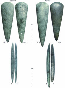 - Deposition in pairs. The deposition in the ground of pairs of polished stone axeheads is well known from the literature, but has only rarely been directly witnessed over the last few decades; most of the recent examples have been of axeheads made form Alpine rocks (Pétrequin et al. 2005). These pairings of axeheads clearly relate to Otherworldly beliefs in which divine twins and mirror effects constitute one of the ‘motors’ driving the world, or even act as an agent in its creation (Cassen 2000).